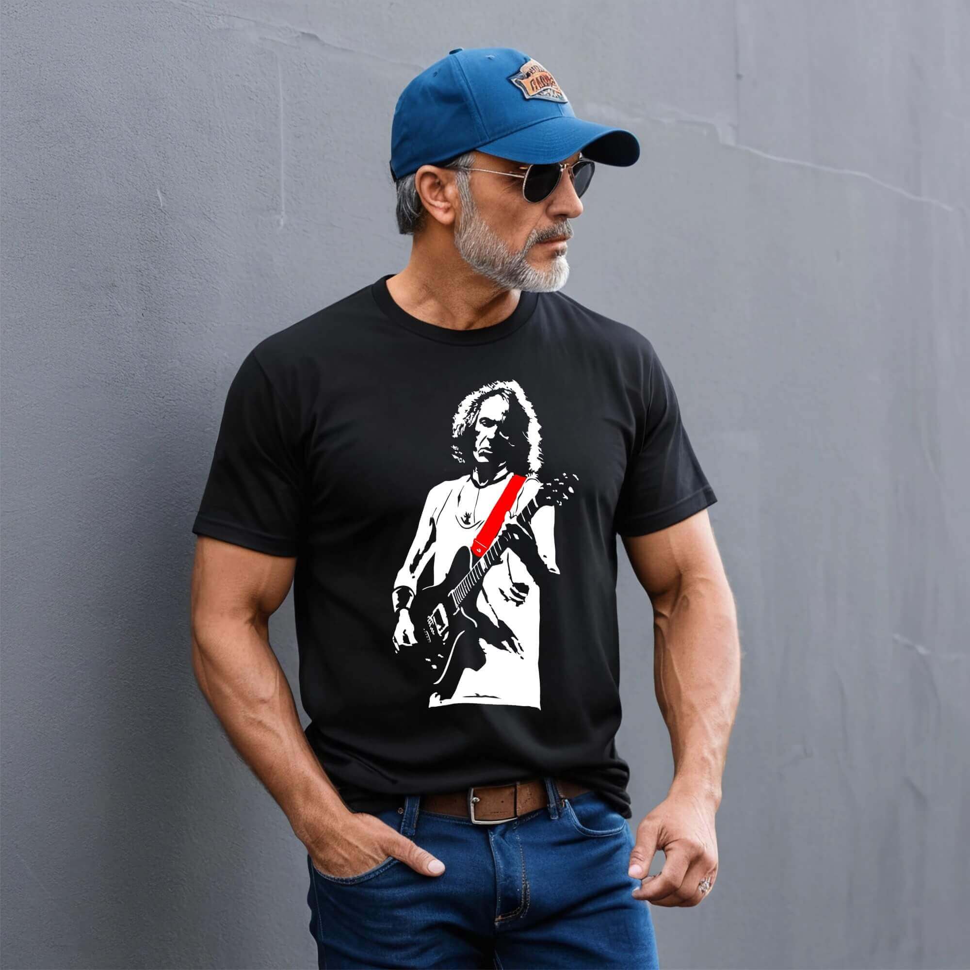 - El estampado artístico presenta un guitarrista en plena actuación, con su guitarra destacada por una correa roja que añade un elemento visual dramático sobre el fondo negro.