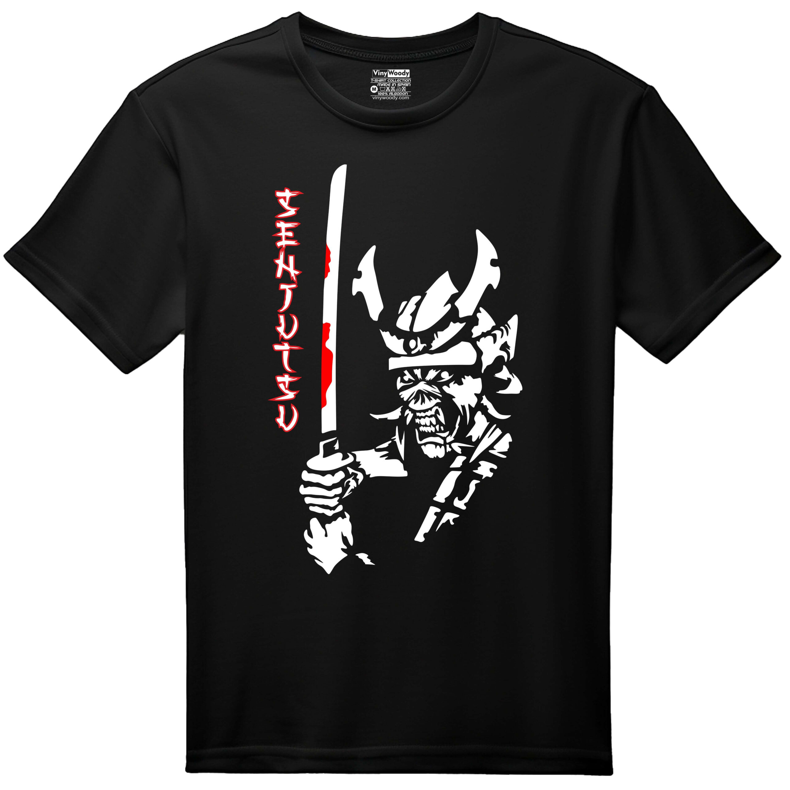 - DISEÑO IMPACTANTE: Camiseta negra con impresión artística de samurái en blanco y rojo, creando un contraste dramático y llamativo