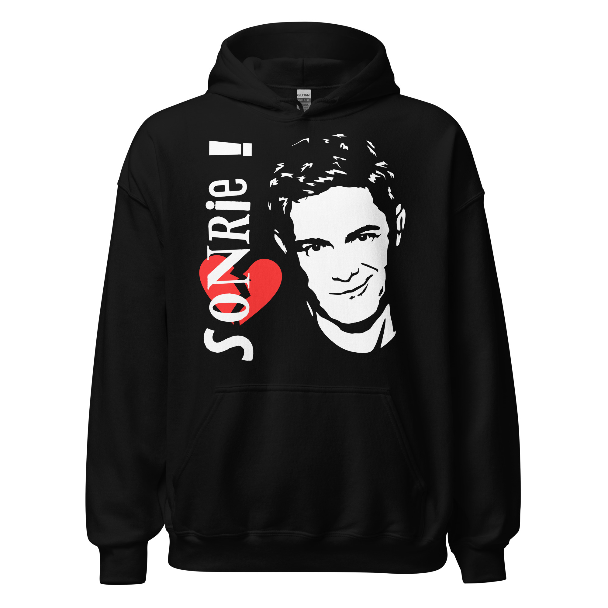 - Esta sudadera negra con capucha presenta un llamativo estampado gráfico de Alejandro Sanz, perfecta para mostrar tu pasión por el rock and roll.